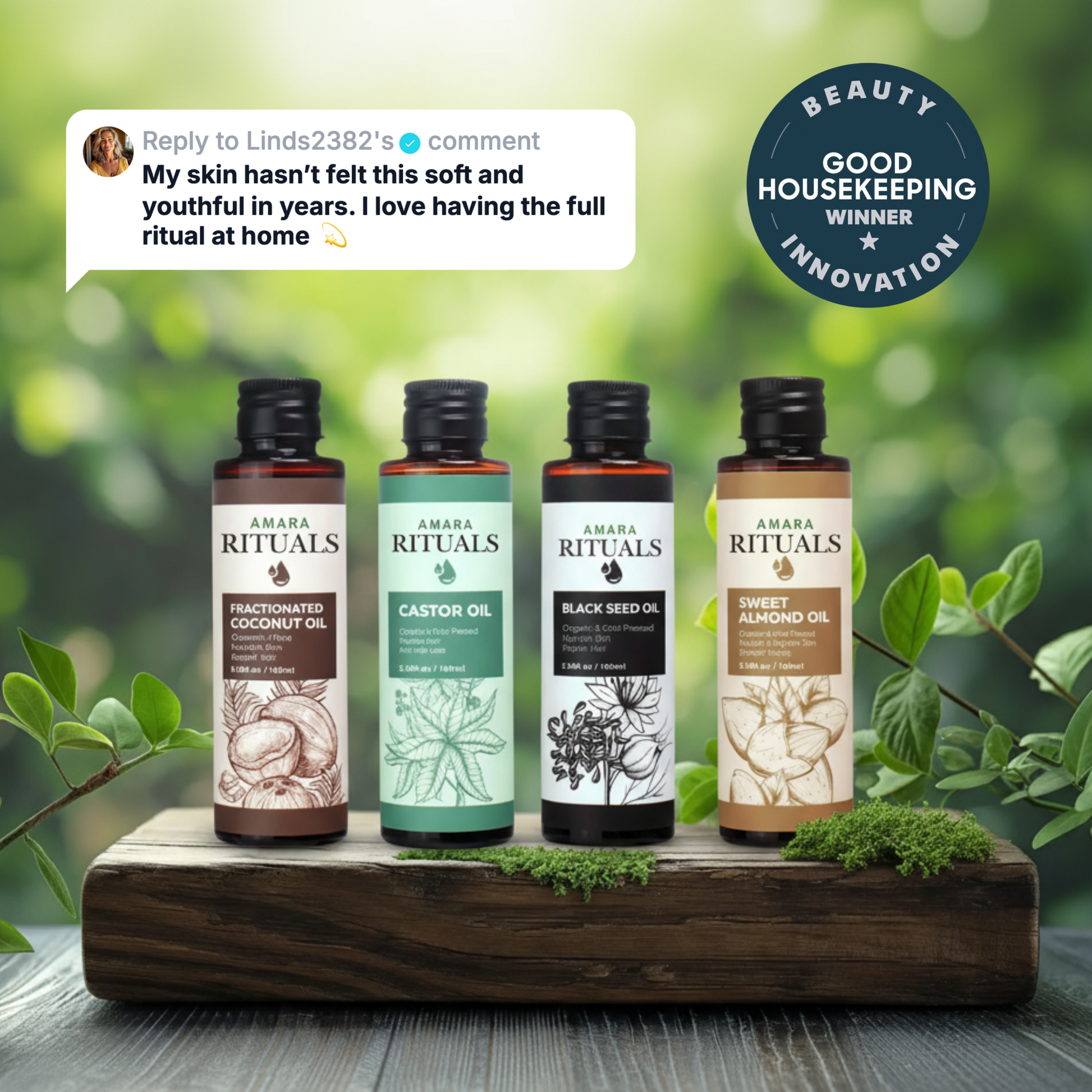 Used alone, each oil is powerful. But when combined, they create a complete Ayurvedic ritual: hydrate, nourish, firm, and protect. That’s why the Complete Ritual Set is designed to give you the full spectrum of benefits — without it, you’re only getting part of the ritual.